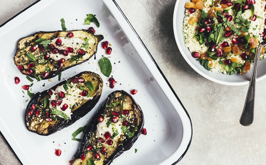 Lad auberginerne køle en smule af, og top så med dressing, hakket mynte, granatæblekerner og et drys dukkah.