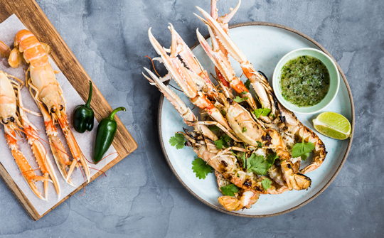 Grill de flækkede jomfruhummere på skalsiden i 2-3 min., og servér dem med korianderdippen.
