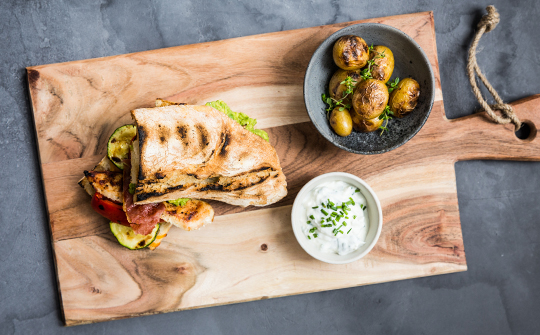 Når alle de grillede elementer er færdige, samles sandwichen ved at smøre avokadomos på den ene side af brødet. Læg derefter serranoskinke på sammen med peberfrugt. På den anden side med ost lægges kylling sammen med courgette. Saml til sidst de to sider og skær den store sandwich i 4 stykker. Spis sandwicherne sammen med de grillede kartofler og fetacremen.