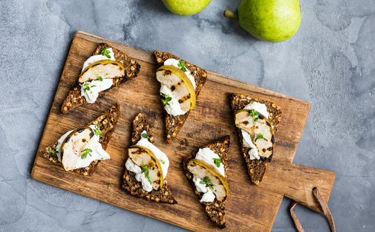 Tip: Ligesom pæren skal grilles til denne lækre snack, så kan du også grille andre faste sommerfrugter. Prøv f.eks. at grille halve friske abrikoser og kom dem i en salat sammen med rucola, fetaost og agurk.