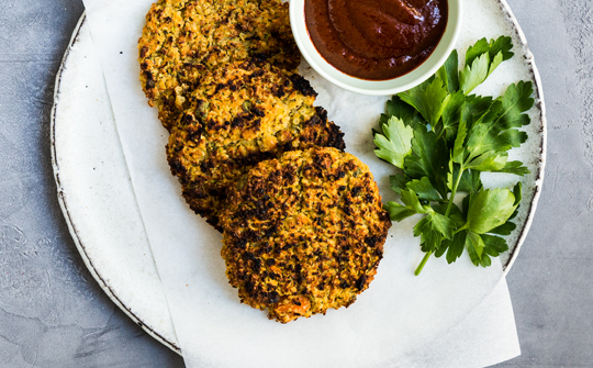 Rør alle de øvrige ingredienser i og form farsen til 6-8 bøffer. Læg bøfferne i en foliebakke, pensel dem med olie og steg dem i 20 min.