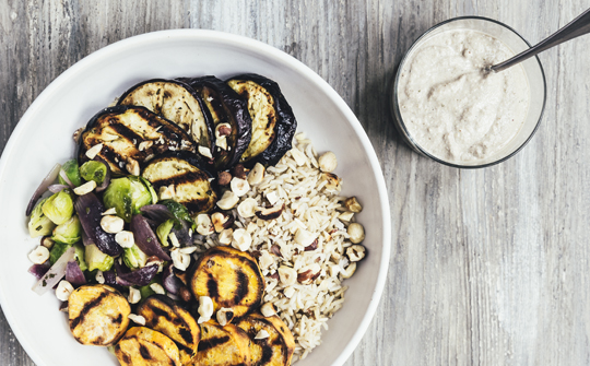 Anret den kogte quinoa i 4 skåle og fordel de grillede grøntsager imellem skålene.
