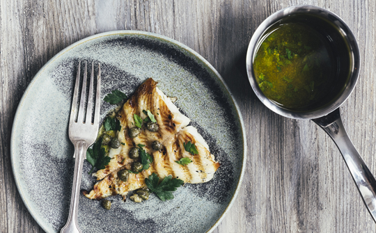 Brun smørret i en gryde, tag gryden af varmen, og smag til med balsamicoeddike, salt og peber. Hak persillen, og vend den i saucen sammen med kapers.