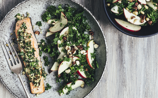 Rengør grønkål grundigt, hak det fint og bland det med æbler og hasselnødder.