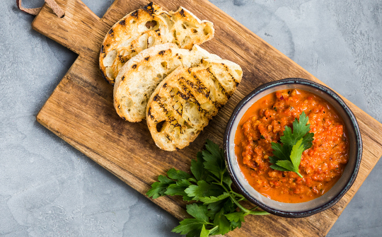 Læg et viskestykke over foliebakken, og lad dem afkøle der. Flå skindet af de bagte peberfrugter, og kom dem i en blender sammen med alle de øvrige ingredienser. Blend det sammen, til konsistensen er helt jævn og cremet. Smag til med surt og salt.