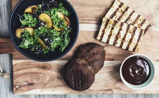 Kom portobellosvampe og tofu på grillen, og grill dem ved medium varme i 15 min. Vend dem halvejs.